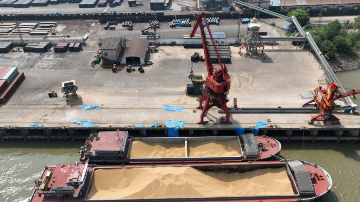 Two ships are being loaded with coking coal, and one is being loaded with grain.
